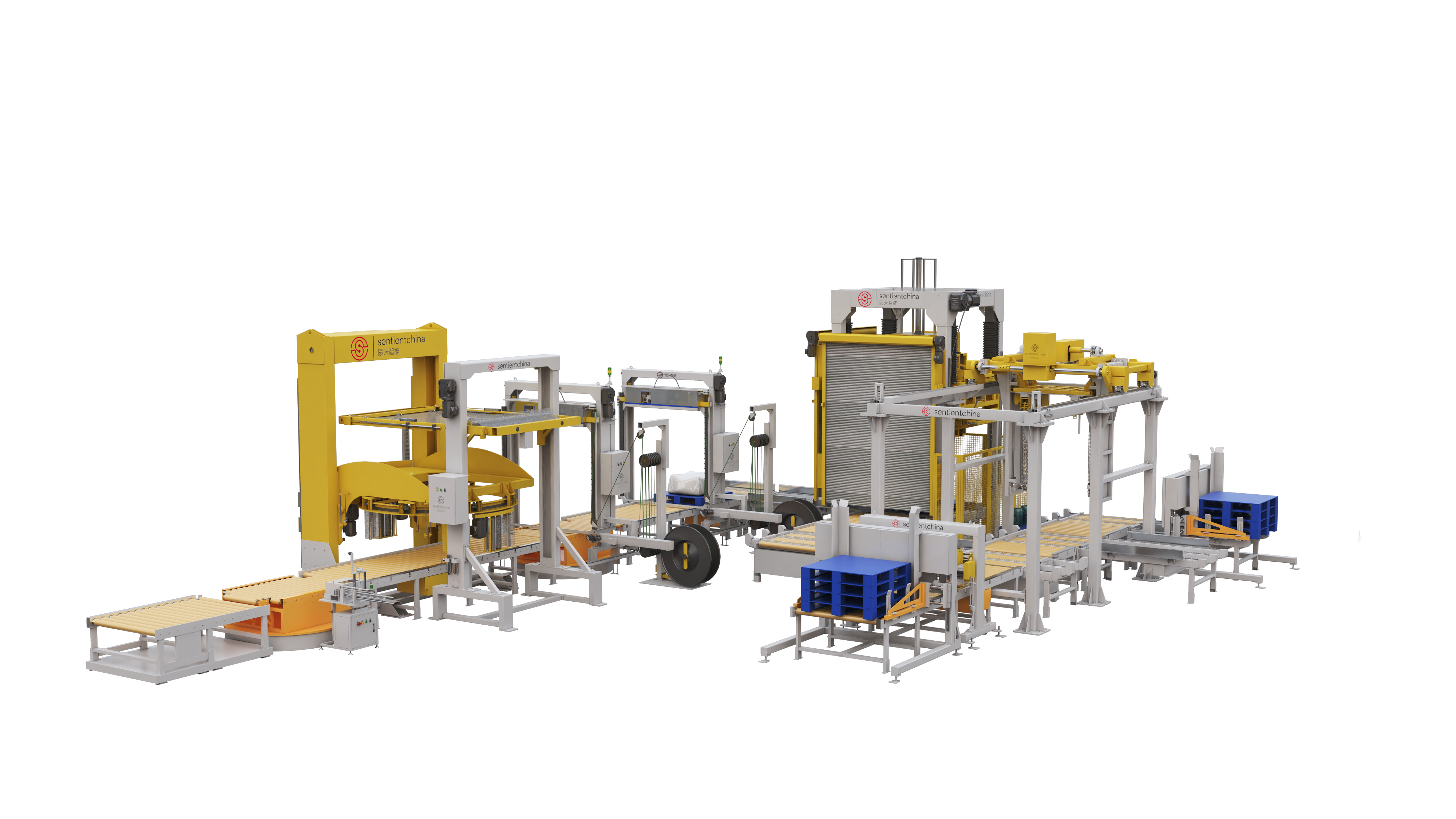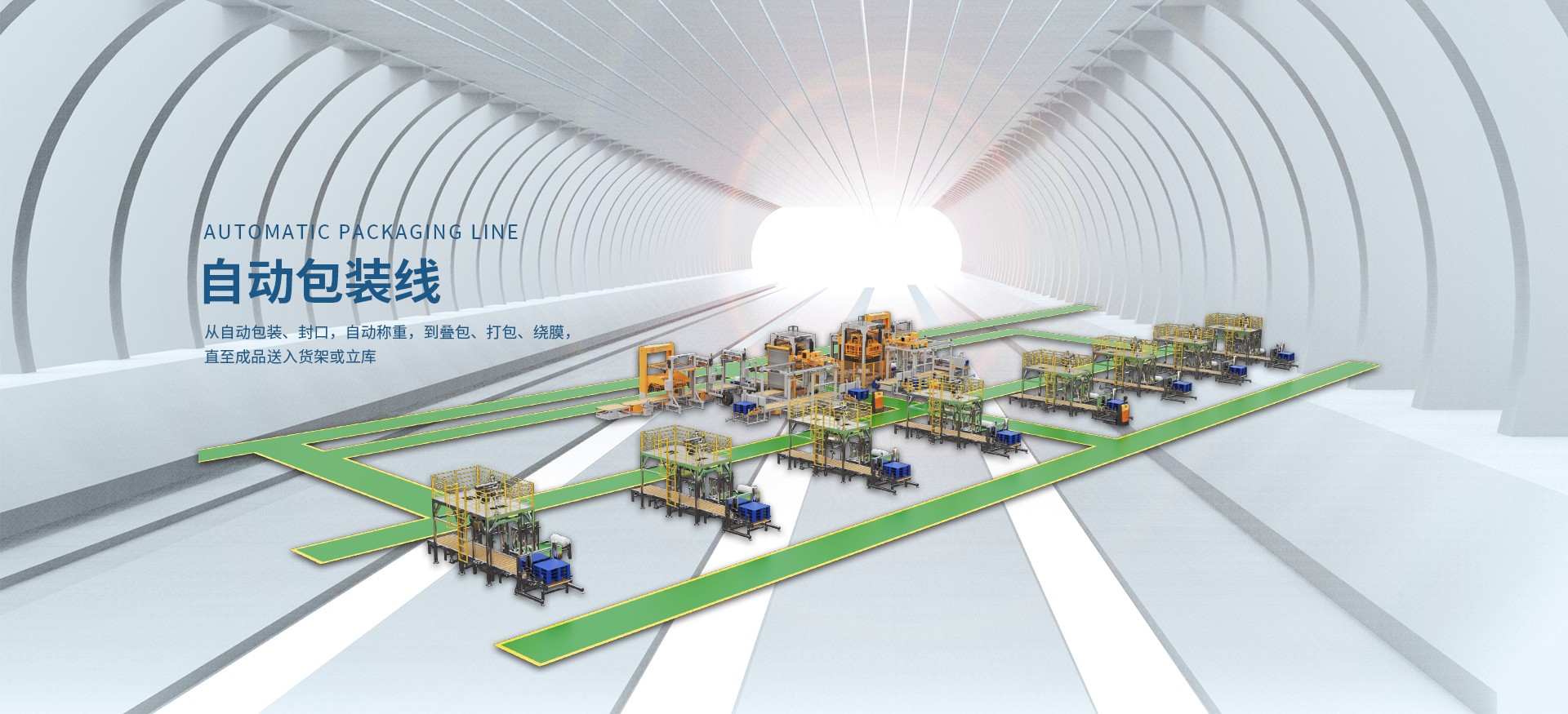 一、自動(dòng)包裝線。從自動(dòng)包裝、封口,自動(dòng)稱重,到疊包、打包、繞膜,直至成品送入貨架或立庫(kù);